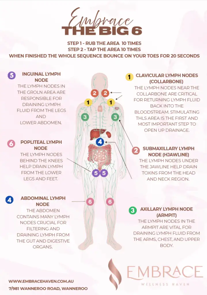 Created by Dr Perry Nickelston, the Big 6 is a simple sequence that clears your major lymphatic drainage points so fluid, inflammation, and toxins can move through the body more efficiently.
